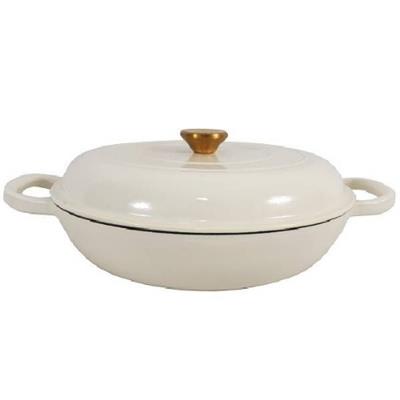 Aqua round enamel cast iron low casserole with handles and gold handle lid. Perfect for braising. Its wide, shallow base and superior heat distribution is ideal for searing meats and veggies. Adding the domed lid locks in and circulates moisture for extra flavour and tenderness. Suitable for oven use, and all stovetops including induction. - Not microwave safe - Hand was recommended Dimensions: 40cm x 31cm x 11.2cm Capacity: 3.5 litre Colour: Ivory |