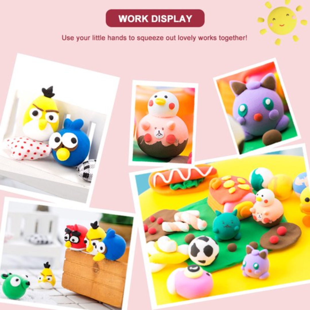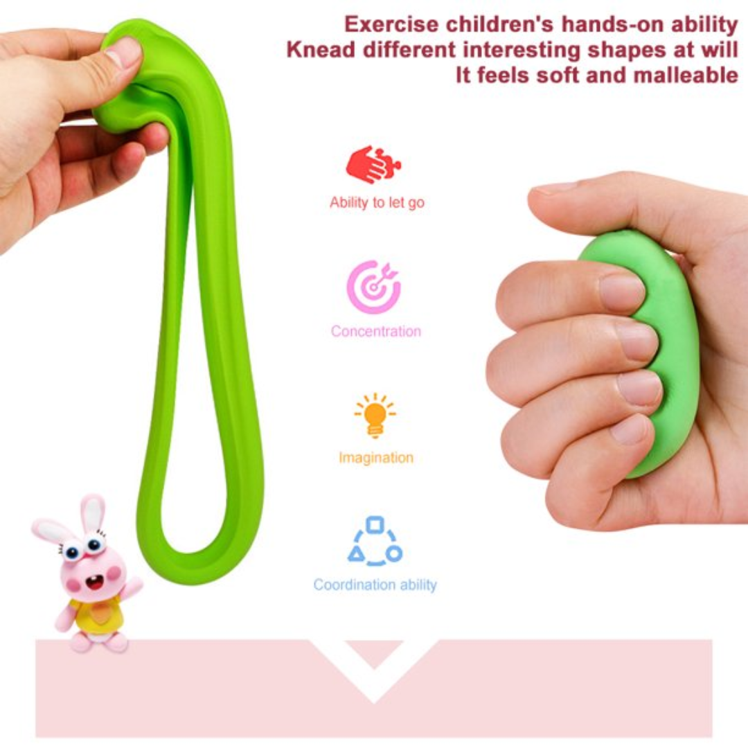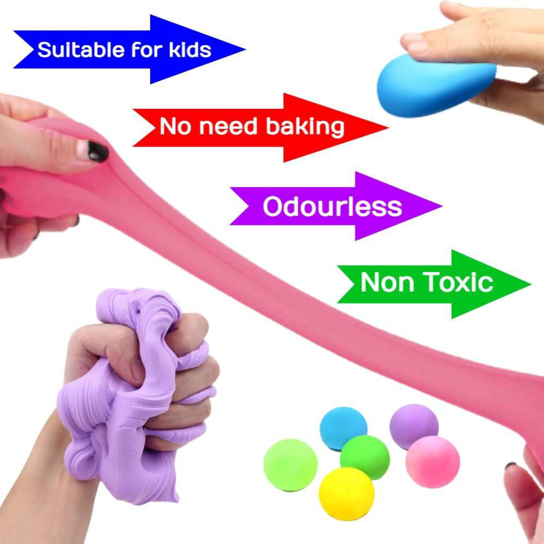 Super lightweight elastic clay, they come in assorted colors that you can collect. It is very flexible, which allows you to mold everything you imagine, because it does not break, it is also very bouncy so can be made into bouncing balls or sculpt your own figurines. The modelling clay helps to learn the material, shapes and scale. It also awakens the sense of touch, sight and imagination. This modern soft version is very pleasant to the touch. Very elastic, it does not break when stretched Stimulate children's creativity and imagination. Not recommended for children under 3 years old. What's in the box |