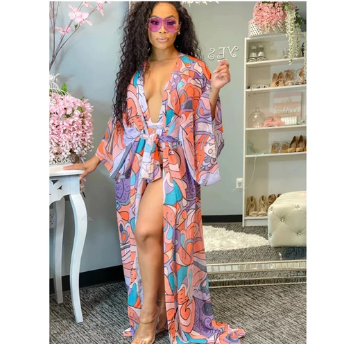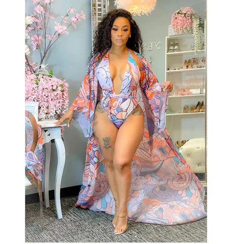 Deep V-Neck One Piece Swimsuit And Cover-up Set