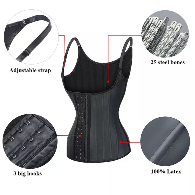 This waist trainer instantly reduces tummy size and provides back support. The 25 spiral steel bones promote weight loss, helping to create an hourglass shape and flatten the stomach. With regular use, it reduces the waistline and promotes a confident posture. Made from firm latex with flat seams, it's designed to be worn underneath clothing and provide up to 3 sizes smaller results instantly. The waist trainer also helps to support a healthy lifestyle and mind. It has a soft cotton exterior and interior lining, 3 rows of hook-and-eye closures, and Flexi boning that anchors and prevents migration. To get an accurate waist size, measure across the bellybutton and refer to the size chart.