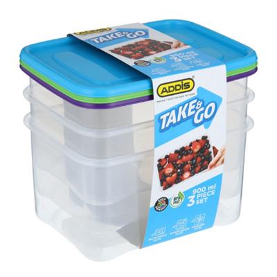 Addis Take and go food storage containers - The brilliant clarity makes it easy to identify the contents - Stackable for optimum fridge organisation - Microwave reheating safe for low fat low sugar foods - Top drawer dishwasher safe - Freezer safe - BPA free Capacity: 900ml Quantity: 3 containers per pack |